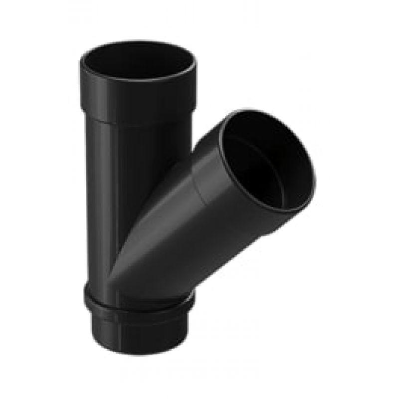 Тройник водосточной трубы предназначен для соединения двух труб диаметром 100 мм из соседних воронок желоба в один слив, одна из которых вставляется вертикально, а вторая под углом 45 градусов.